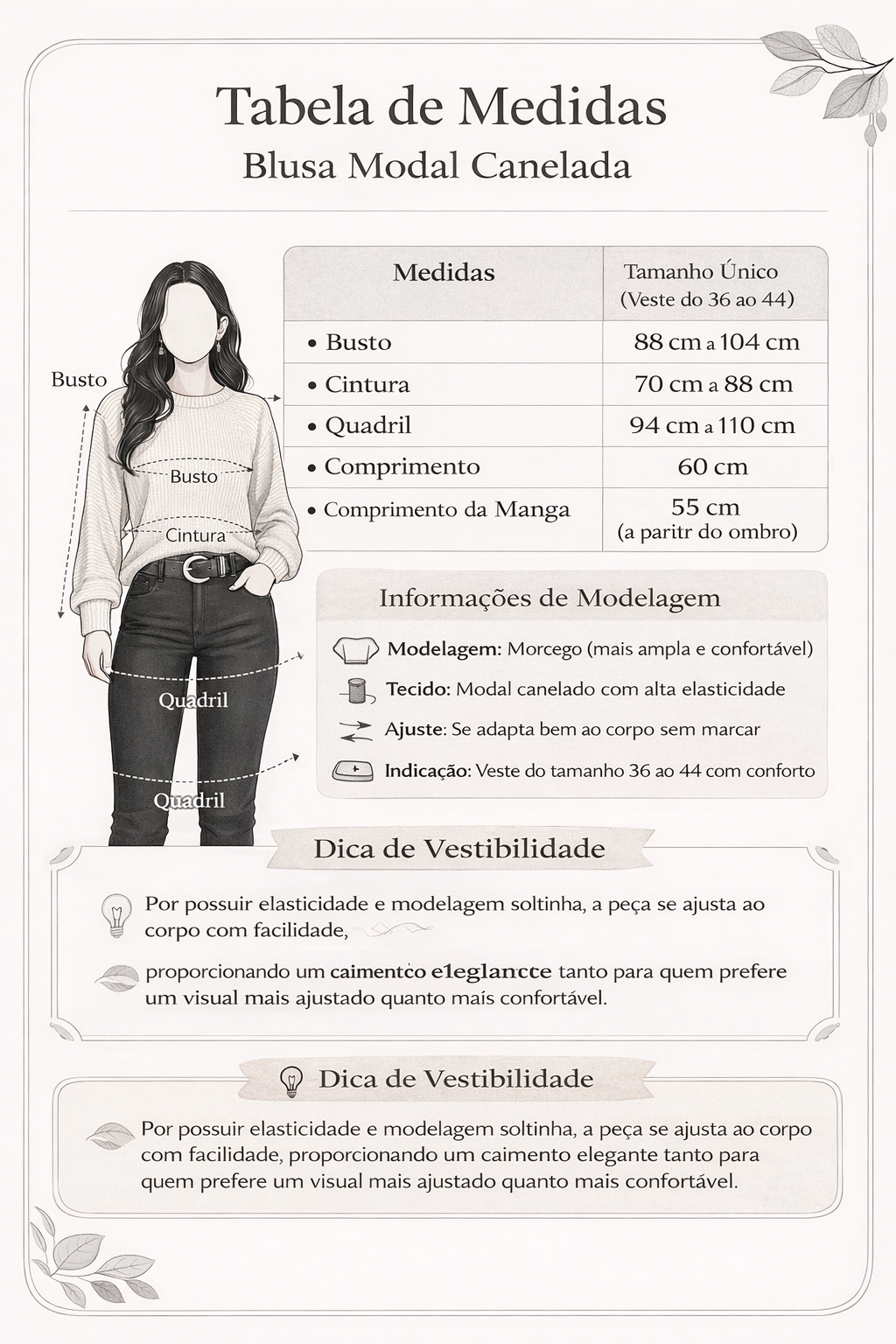 A modelagem morcego traz um visual moderno e sofisticado, proporcionando leveza ao look sem abrir mão do conforto. Já o acabamento canelado adiciona textura e estilo, deixando a peça ainda mais atual e versátil.