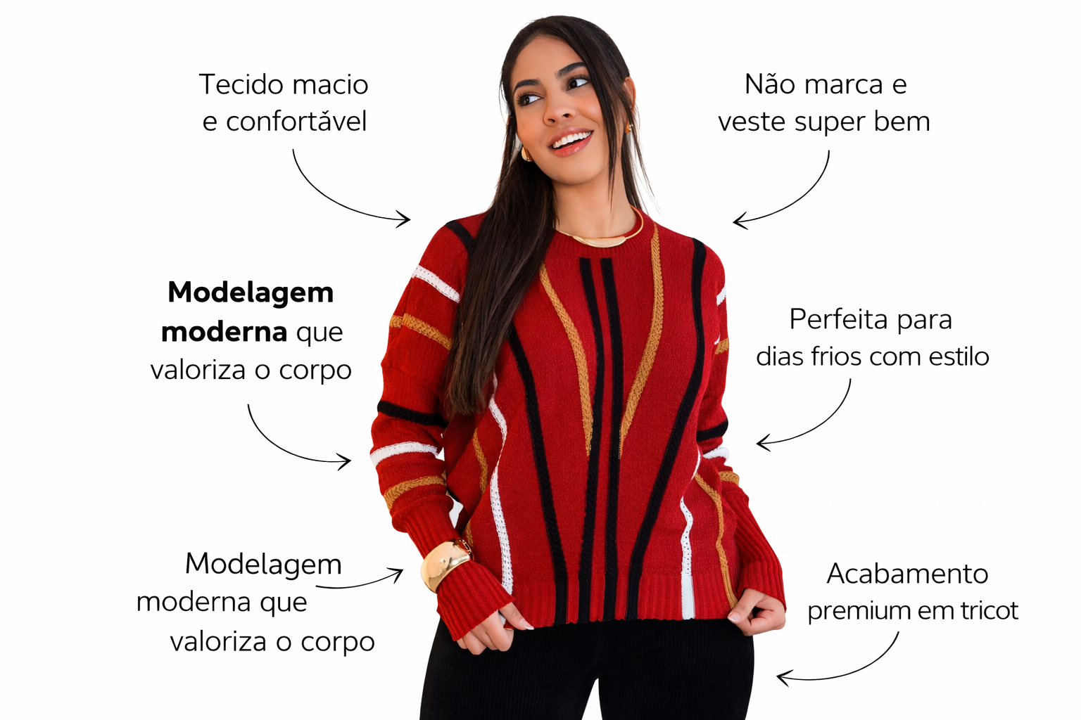Descubra a combinação perfeita entre estilo moderno e conforto absoluto com a nossa blusa de frio feminina em tricot listrado. Uma peça versátil, elegante e indispensável para os dias mais frios.