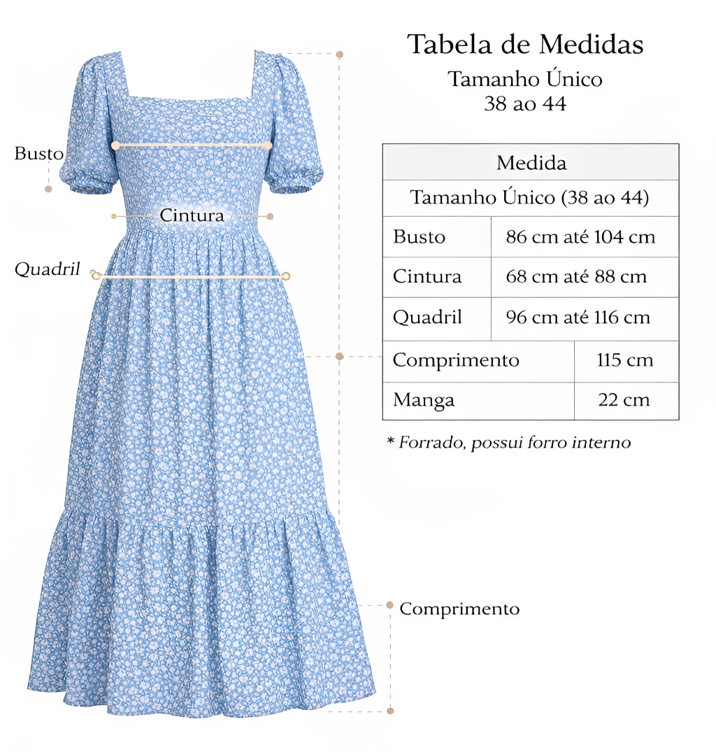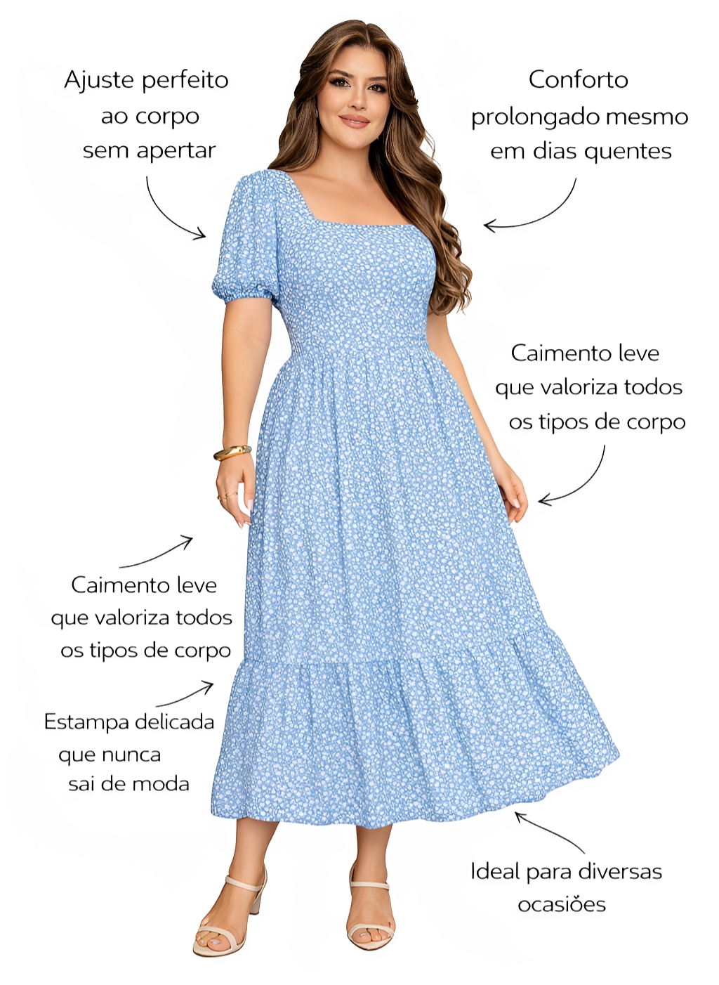 A estampa floral suave combinada ao comprimento midi cria um visual feminino, elegante e extremamente versátil — fácil de combinar com sandálias, salto ou até tênis para um look mais moderno.