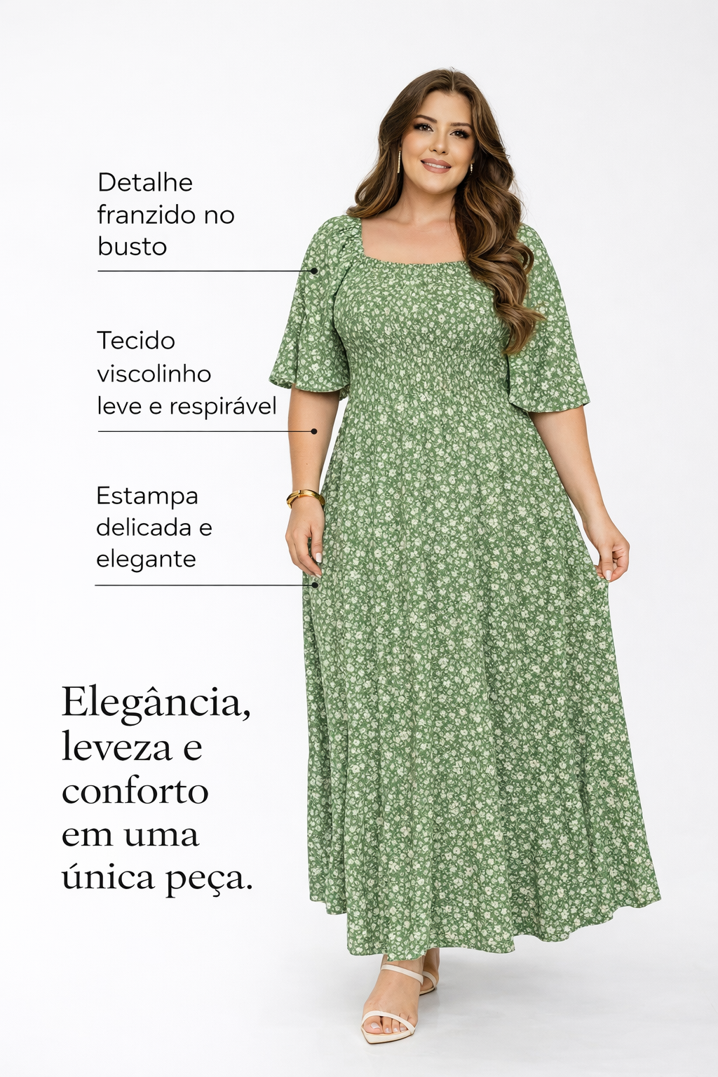 Seu design delicado conta com busto franzido que valoriza a silhueta, mangas confortáveis e estampa suave que transmite sofisticação e feminilidade. O comprimento longo traz um toque refinado ao look, tornando o vestido uma excelente opção tanto para o dia a dia quanto para eventos casuais ou momentos especiais.